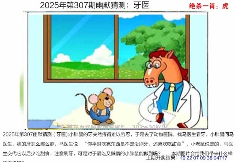 小胖鼠的牙突然疼得难以容忍,于是去了动物医院,找马医生看牙,小胖鼠问马医生,我的牙怎么那么疼,马医生说:“你平时吃完东西是不是没刷牙,还喜欢吃甜食”,小老鼠说是的,马医生交代它以后少吃甜食,注意刷牙,可是对于爱吃又懒惰的小胖鼠能做到吗?......本期图片会给我们带来什么样的玄机呢? 解:马医生解后肖马羊猴鸡狗猪 推荐生肖:马羊猴鸡狗  |
